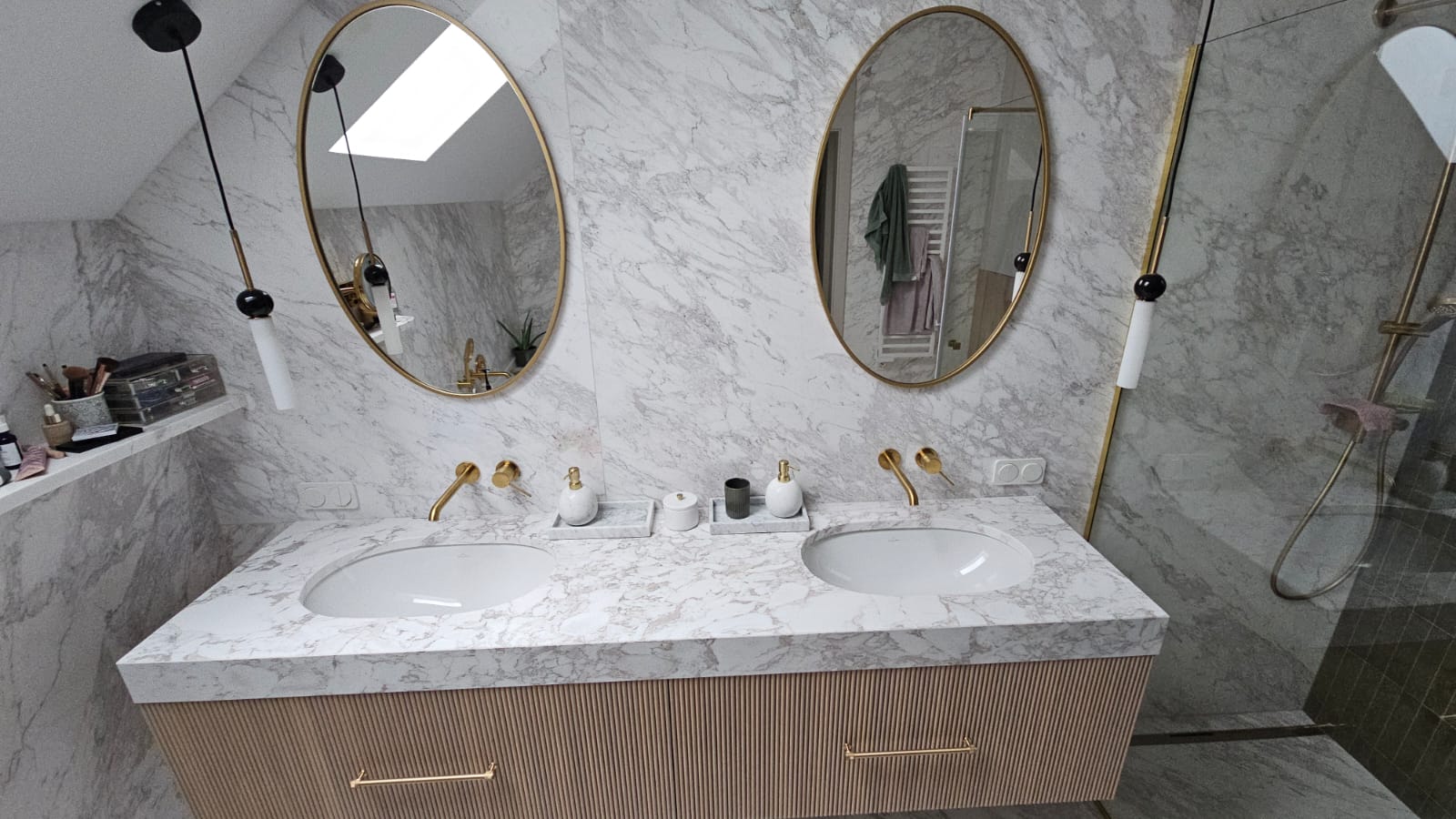 Konglomerat Technistone Crystal Polar White w łazience